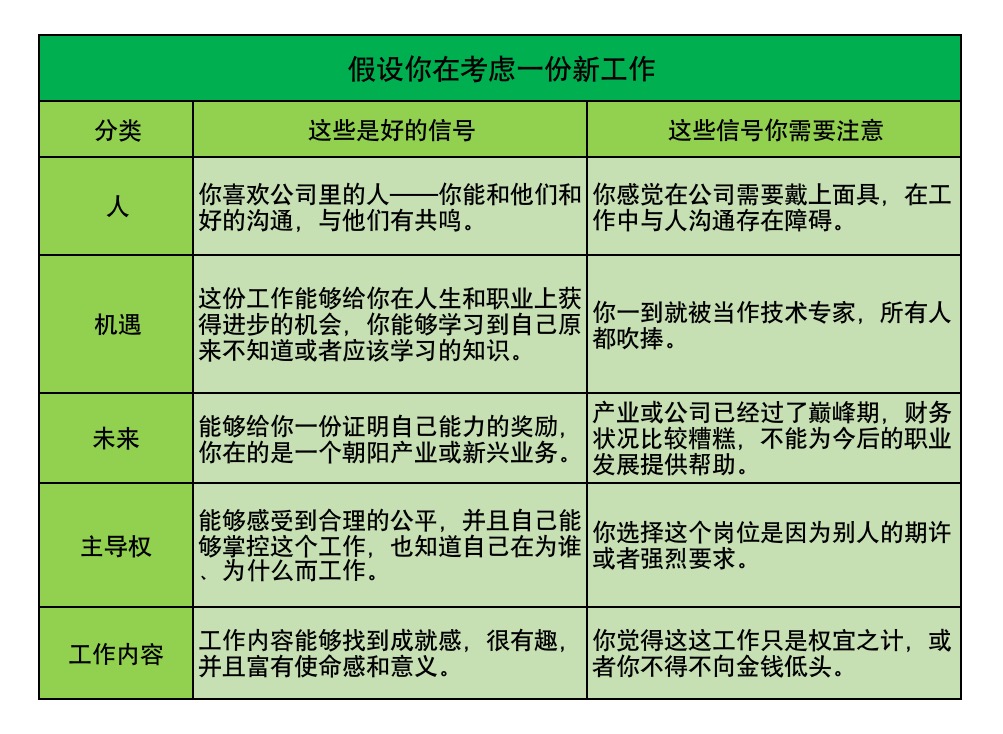 大多數(shù)工作都會發(fā)出適合你或者不適合你的信號,通過這下邊的表,你就能判斷出那些是好的信號、哪些是糟糕的信號: