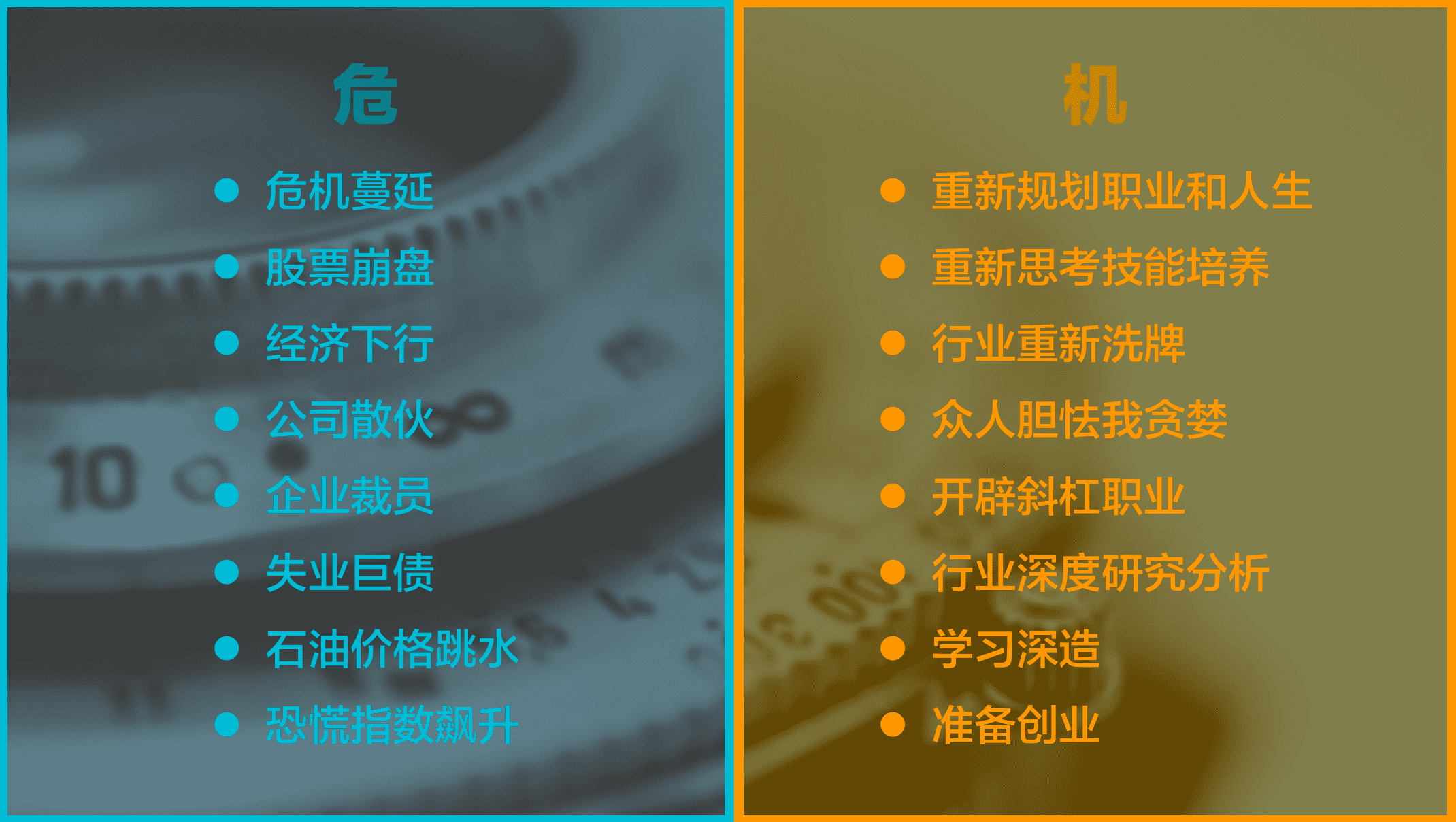 爆發(fā)的危機(jī)和一系列的連鎖反應(yīng),當(dāng)全方位挑戰(zhàn)來臨時(shí),需要提升自己的學(xué)習(xí)力去應(yīng)對每個(gè)行業(yè)專業(yè)之間的差距,這樣才能在新機(jī)會來臨的時(shí)候牢牢的把握住。